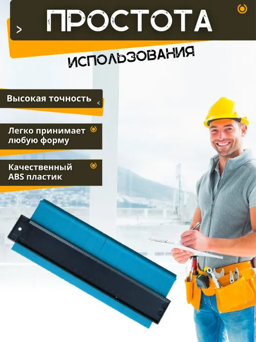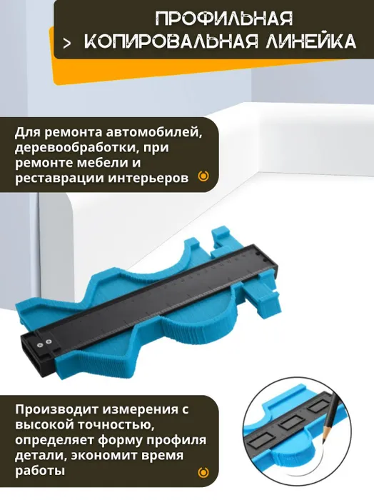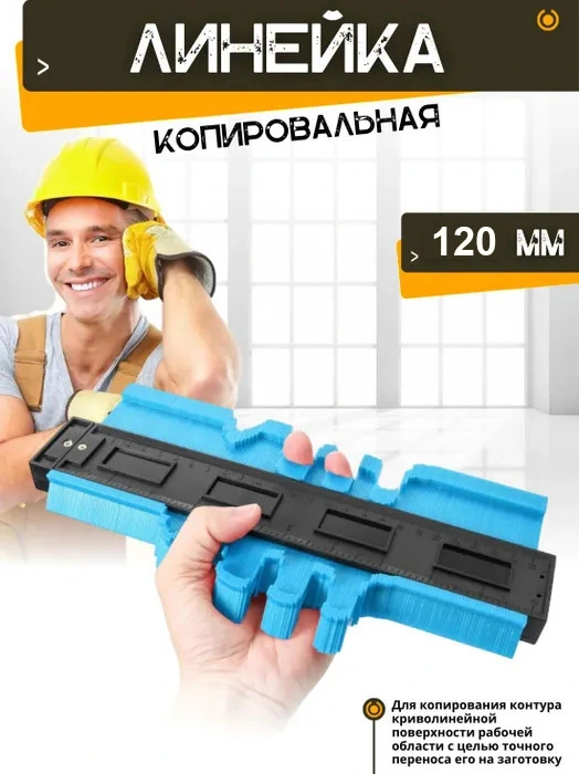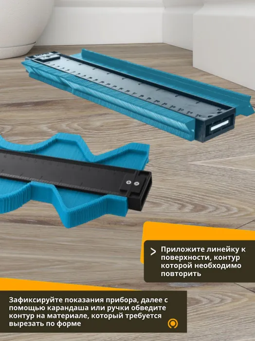 Инструмент состоит из системы параллельных пластин, которые свободно перемещаются параллельно друг другу. Необходимо приложить линейку к поверхности, контур которой необходимо повторить. Зафиксировать показания прибора, далее с помощью карандаша или ручки обведите контур на материале, который требуется вырезать по форме. Для вашего удобства контурный шаблон имеет шкалу линейки.